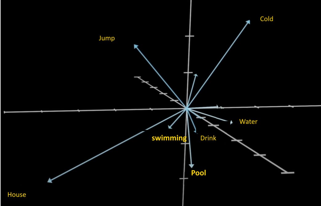 You might think in one or two dimensions, where "water" and "pool" are semantically close. But by collecting massive amounts of data and understanding context (I'll discuss Transformers in a future article), thousands of dimensions are built. The likelihood is determined by distance...